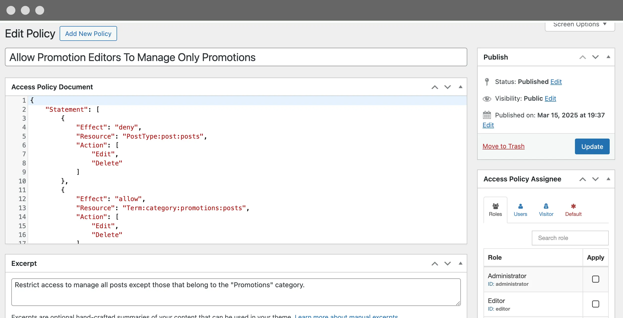 Define, store, and apply access rules as structured JSON policies — ensuring consistency, portability, and automation across roles, users, and visitors.