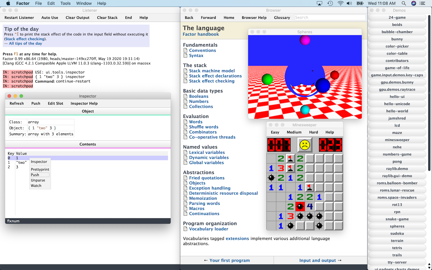 The Factor programming language is a concatenative, stack-based programming language with high-level features including dynamic types, extensible syntax, macros, and garbage collection. On a practical side, Factor has a full-featured library, supports many different platforms, and has been extensively documented.