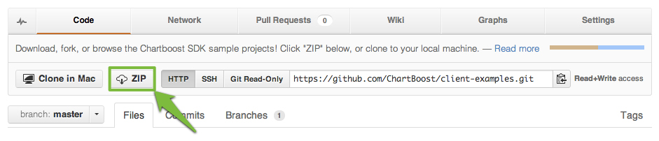 In this repo, you'll find two Chartboost example integrations: one for iOS games, and one for apps on the Android side. To get started, hit the ZIP button to download the repo: