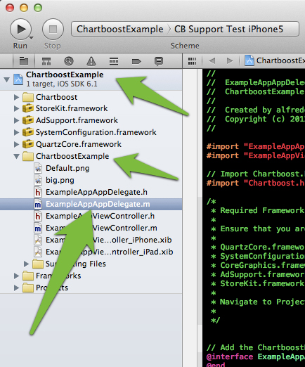 - Navigate to the ExampleAppAppDelegate.m file by expanding the menus shown below: