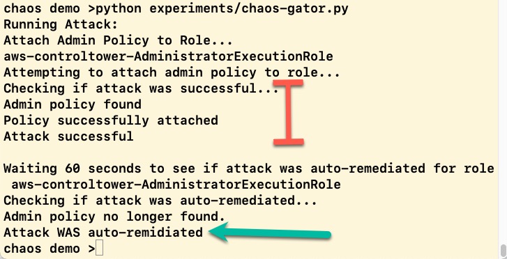 Taking this example further you can add reporting to your SOC team, for example automatically posting to a Slack channel that adding the AdministratorAccess policy was attempted. You could also turn off autoremediation and see how long it takes the SOC team to detect (MTTD) and remediate it (MTTR).
