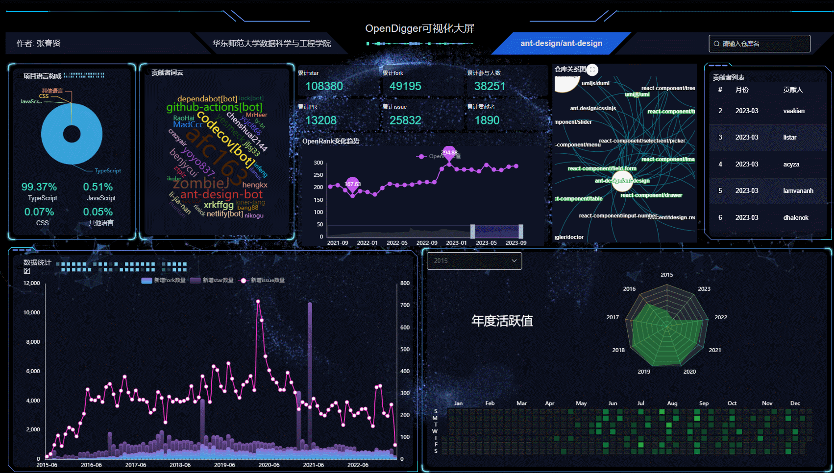 An online accessible, interactive visualization screen. Data from X-lab2017/open-digger and Github API.