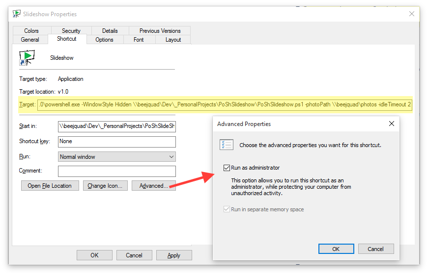 C:\Windows\System32\WindowsPowerShell\v1.0\powershell.exe -WindowStyle Hidden \\beejquad\Dev\_PersonalProjects\PoShSlideshow\PoShSlideshow.ps1 -photoPath \\beejquad\photos -idleTimeout 2 - select Run: Minimized to make script launch more polished