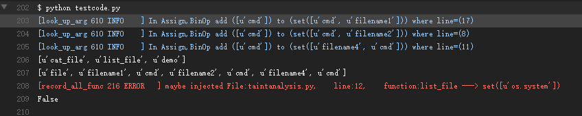 - 二元运算语句。对于二元运算语句,如果参与运算的一个变量是污点数据,那么运算结果也被标记成污点数据。比如对于加法运算语句cmd = "cat " + filename。
