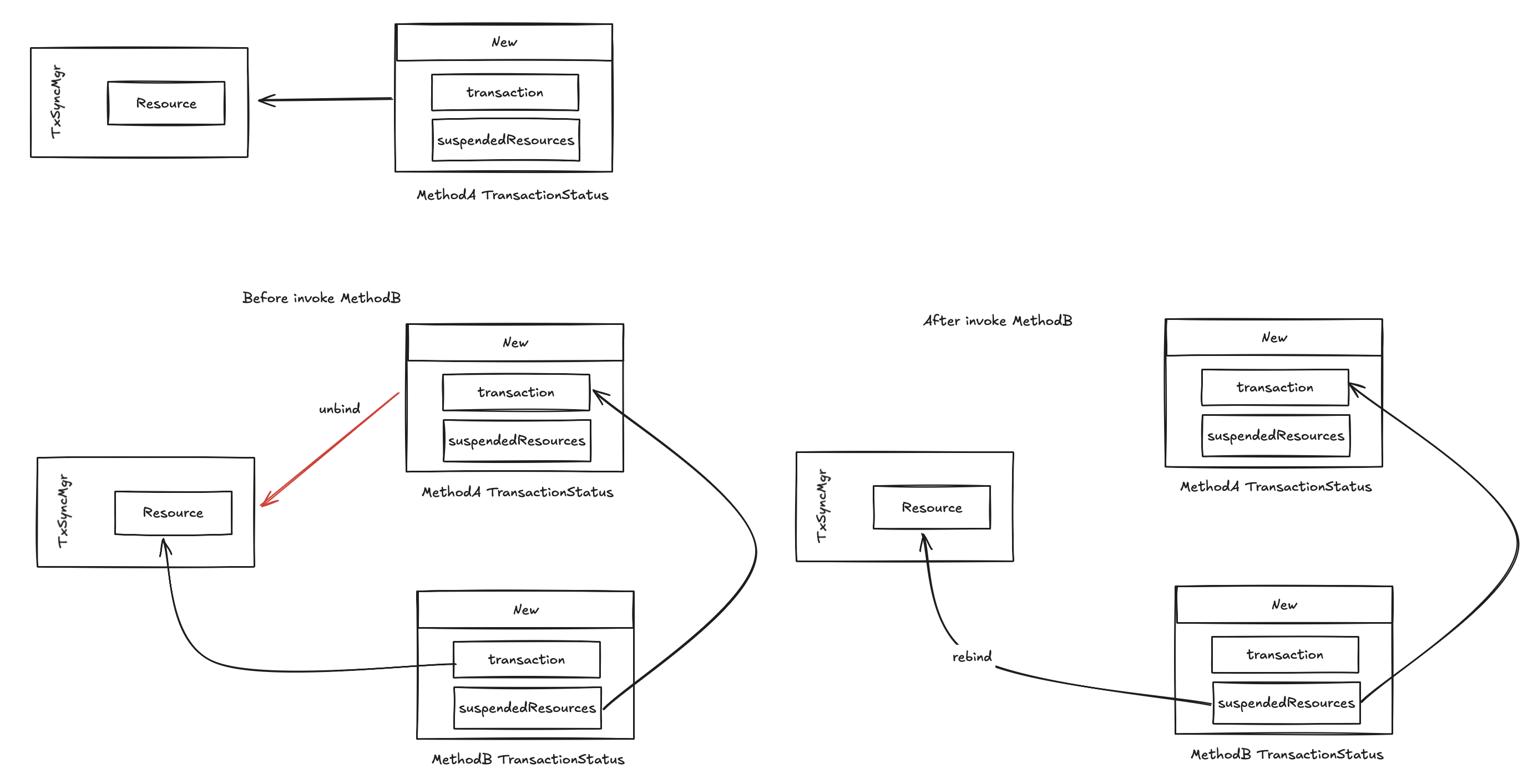 Spring 采用了一种挂起(Suspend) - 恢复(Resume)的设计来解决这个嵌套资源处理的问题。当子方法需要独立事务时,就将当前事务挂起,从 TxSyncMgr 中移除当前事务资源,创建新事务的状态时,将挂起的事务资源保存至新的事务状态 TransactionStatus 中;在子方法结束时,只需要再从子方法的事务状态中,再次拿出挂起的事务资源,重新绑定至 TxSyncMgr 即可完成恢复的操作。整个挂起 - 恢复的流程,如下图所示:
