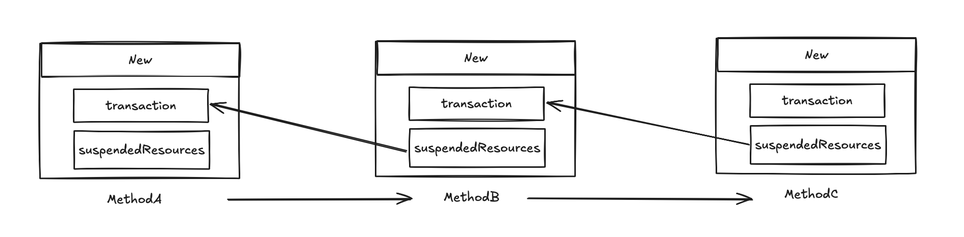 这样一来,每个 TransactionStatus 都会保存挂起的前置事务资源,如果方法调用链很长,每次都是新事务的话,那这个 TransactionStatus 看起来就会像一个链表: