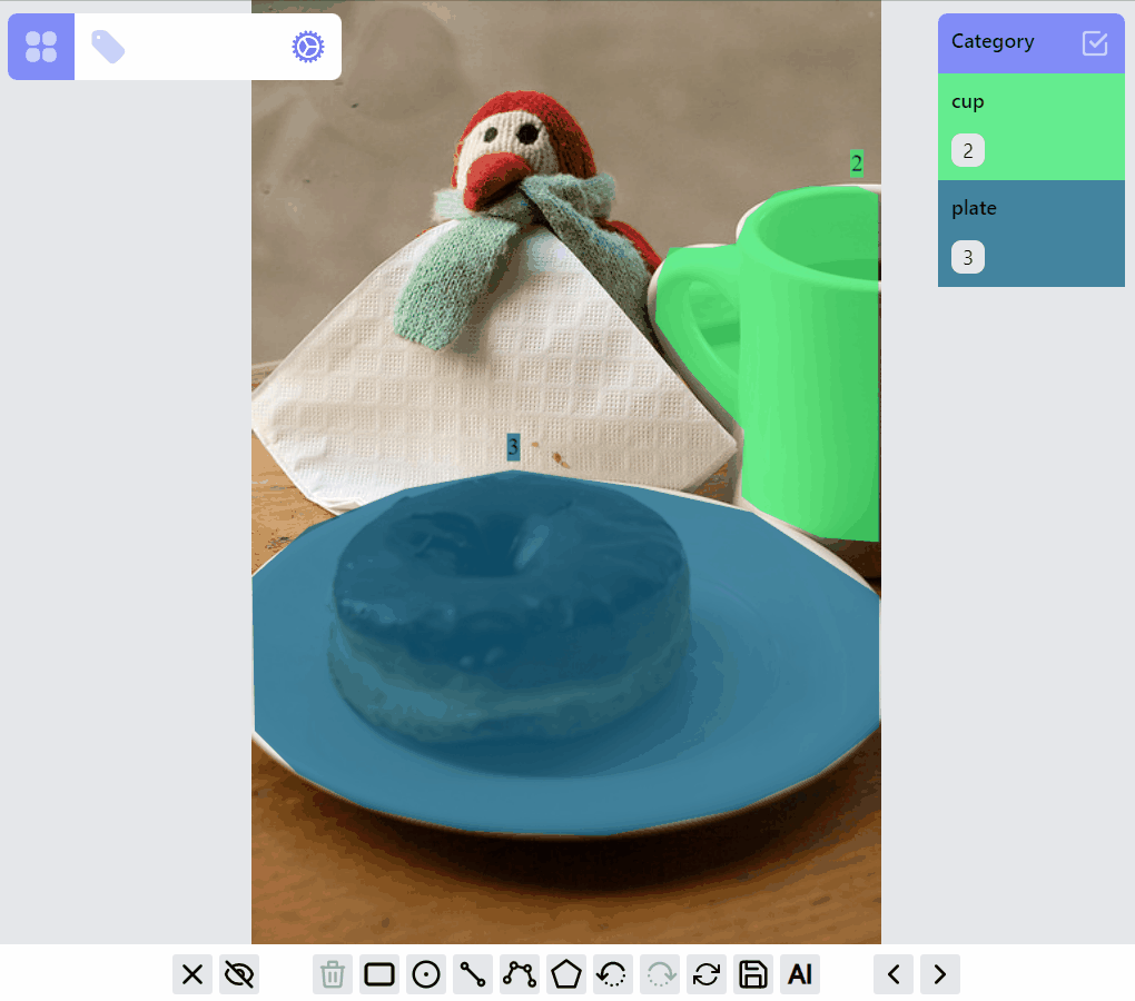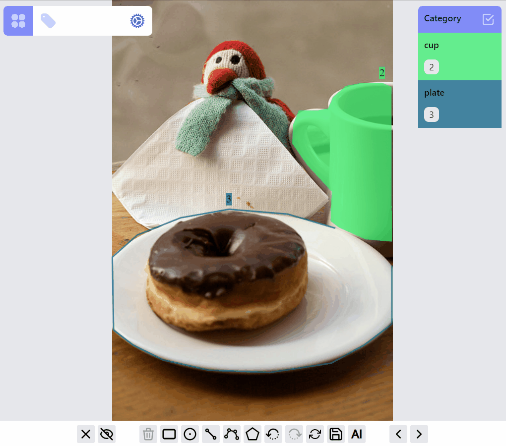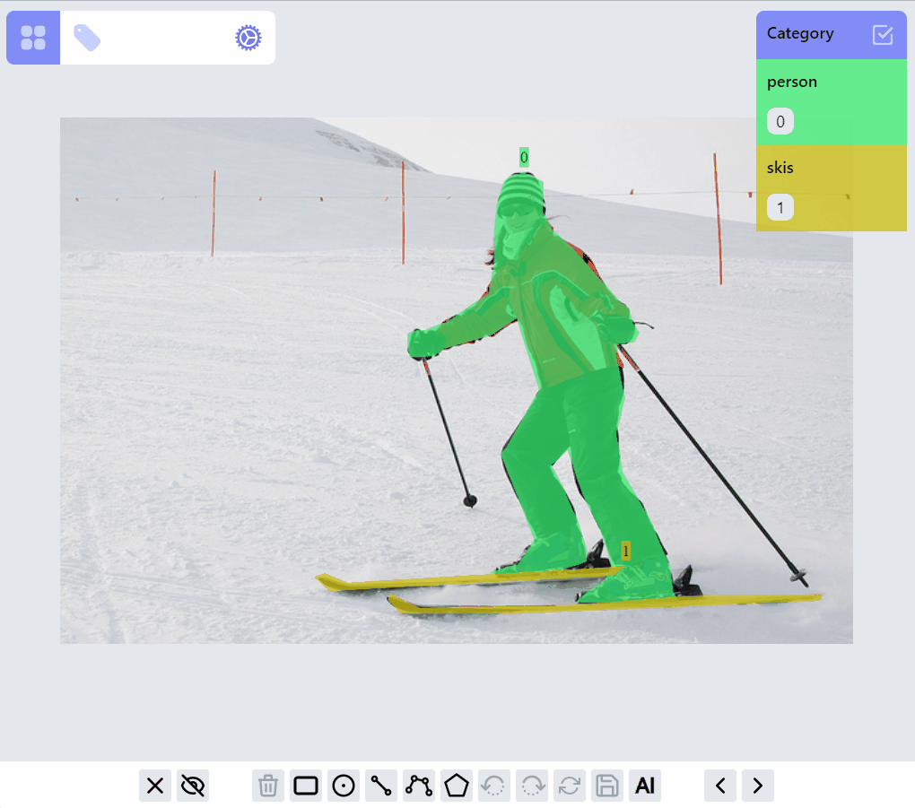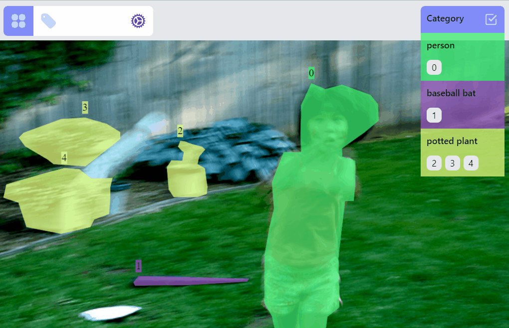For each label, it can be in different RenderMode: hidden, preview, drawing, selected. All labels of an image are initially rendered with preview mode. When adding/drawing a new label, all existed labels are in hidden mode, and the label on drawing is in drawing mode. Labels can be selected/filtered by clicking on the canvas objects, or clicking on the category and ids. Nonselected labels will be in hidden mode, while selected labels will be in selected mode, or preview mode depending on how many labels are selected.