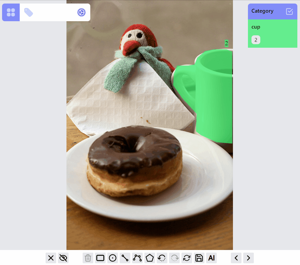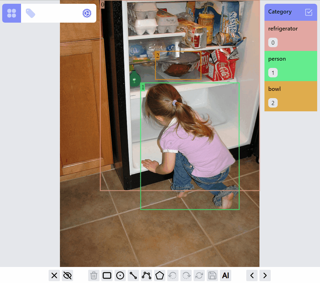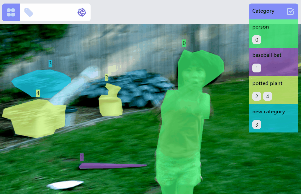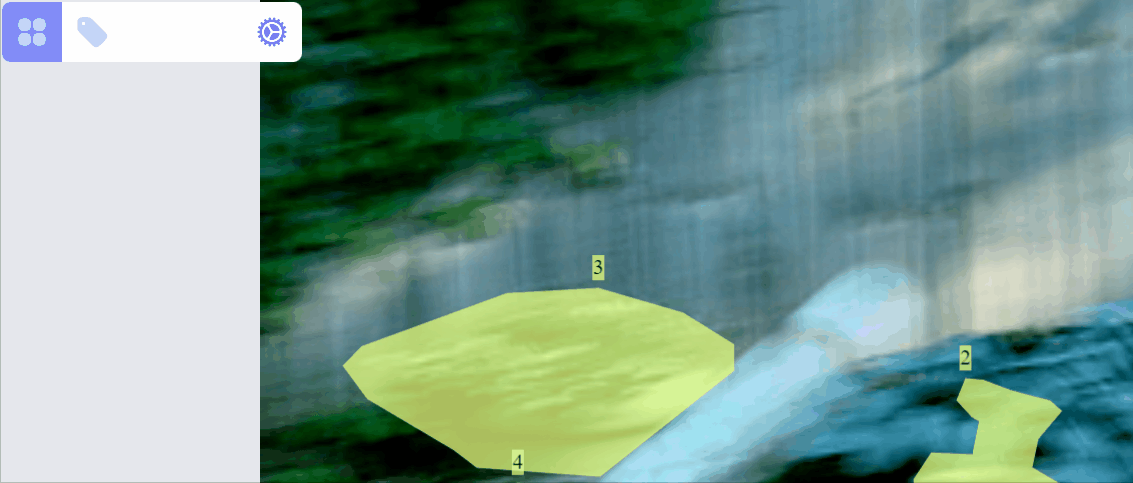 For each label, it can be in different RenderMode: hidden, preview, drawing, selected. All labels of an image are initially rendered with preview mode. When adding/drawing a new label, all existed labels are in hidden mode, and the label on drawing is in drawing mode. Labels can be selected/filtered by clicking on the canvas objects, or clicking on the category and ids. Nonselected labels will be in hidden mode, while selected labels will be in selected mode, or preview mode depending on how many labels are selected.