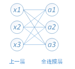 比如图中全连接层的节点 a1 与上一层的所有节点 x1、x2、x3 有联系,a2 也与上一层的所有节点有联系,就这样,少一个也不行。因此解释全连接层的时候,图就是上面这样一个网状结构。