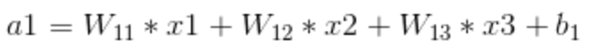 假设 x1,x2,x3 是全连接层的输入值,那么在全连接层的 a1 可以表示为以下的形式。