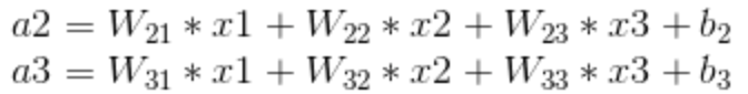 从这个公式可以看出,a1 与 x1,x2,x3 都有联系,只是输入节点的权重值不同。同理,a2 和 a3 也可以表示为以下的形式。