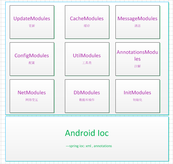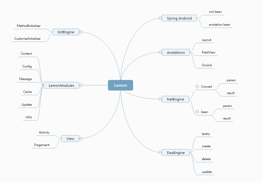 lemon初衷是让android开发更简单,核心实现了一个轻量级别的控制反转(IoC) ,通过配置XML和注解的方式使得代码之间松耦合,当应用了IoC,一个对象依赖的其它对象会通过被动的方式传递进来,而不是这个对象自己创建或者查找依赖对象。构建与IOC核心之上做了如下几个模块: