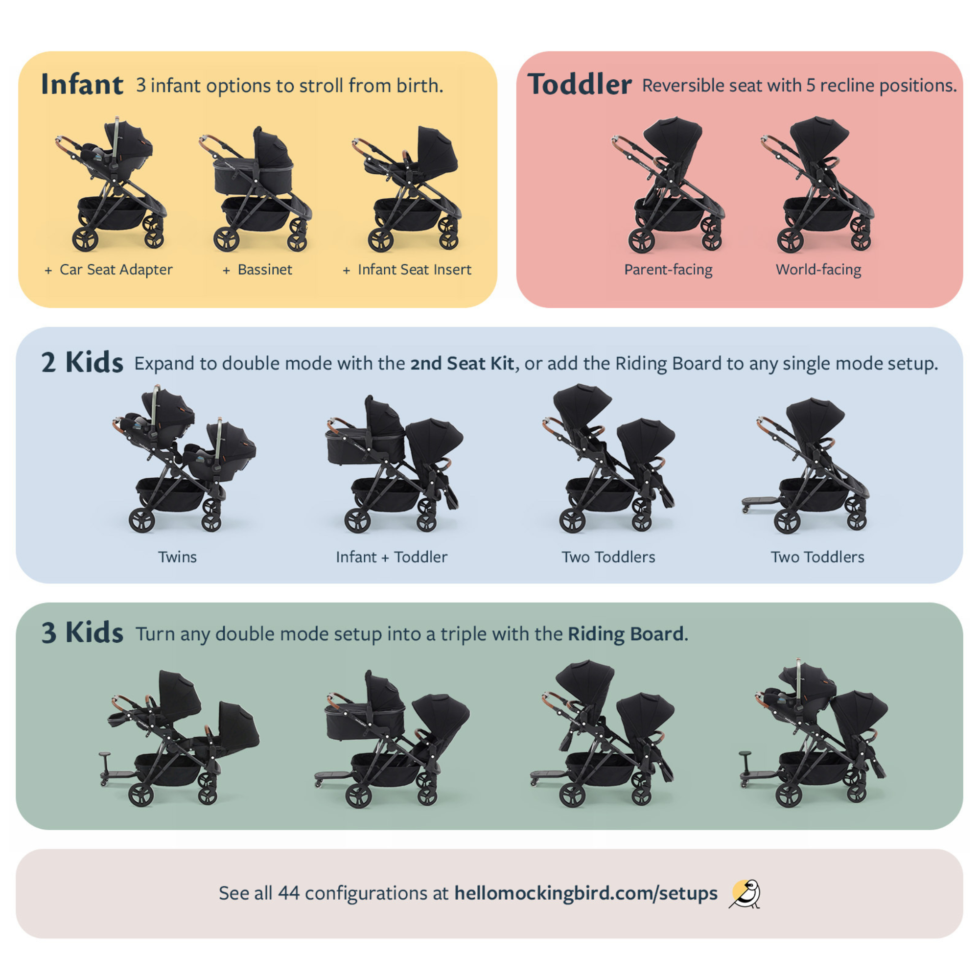 What are all the different arrangements for the Mockingbird Single-to-Double Stroller?