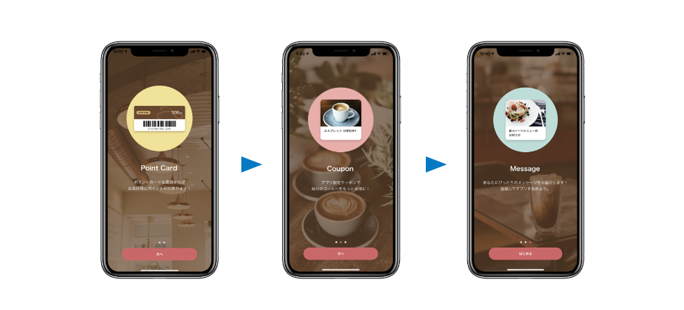 アプリの初回起動時にアプリの使い方やメリットを表示する機能です。アプリの起動時に使い方が分かるので、ユーザーの迷いを減少させます。アプリの利用意図がユーザーに伝わり、利用頻度が向上します。