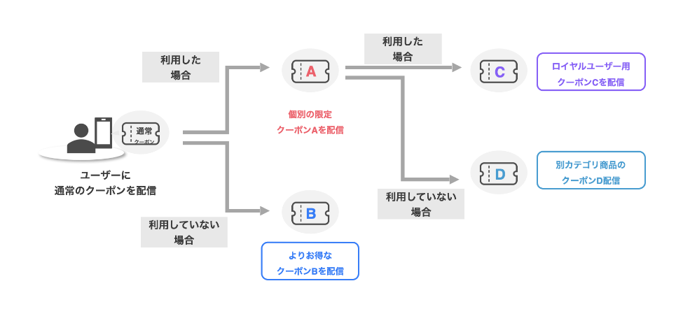 アプリユーザーの行動に応じた施策を実行できる機能です。アプリを過去〇日以内にダウンロードした、過去〇日以内に会員登録を行った、特定のバナー・クーポンを利用した、等のユーザー行動に応じて、次に実施する施策(プッシュ配信、クーポン配信等)を自動で変更することが可能です。
