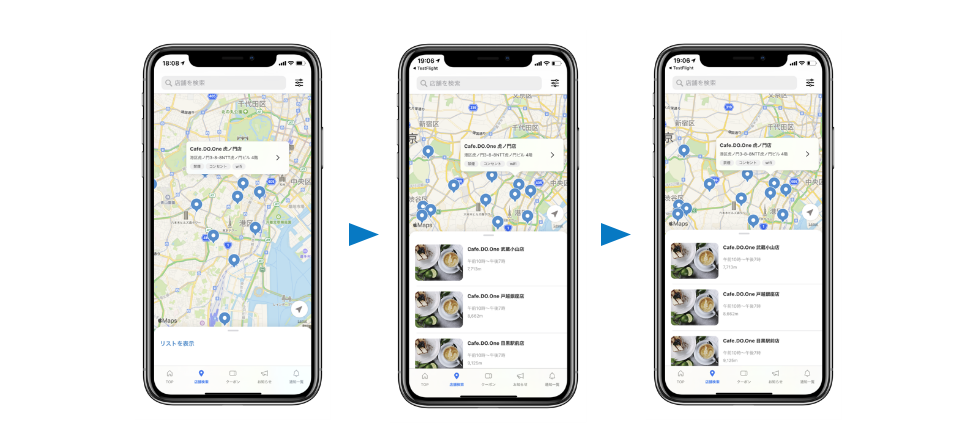 店舗の一覧は地図上に表示され、最寄りの店舗が一目でわかります。地図表示と一覧表示が簡単に切りかえることもできます。