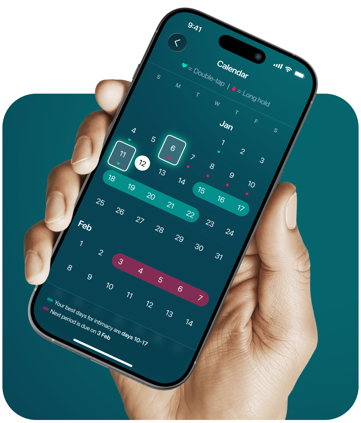 We solved the challenge of dual-purpose logging by utilizing native gesture patterns. Instead of cluttered menus, we implemented a double-tap for intimacy and a long-hold for period logging. This keeps the calendar interface clean and discreet while maintaining a fast, frictionless user experience.
