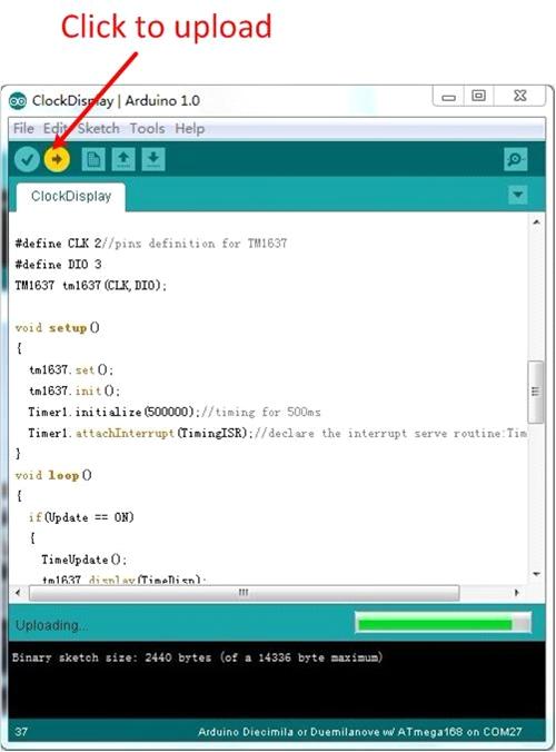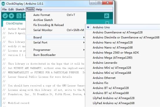 - Select the type of Arduino board that you are using by the path: Tools --> Board --> for example, Arduino UNO after you have open a demo.