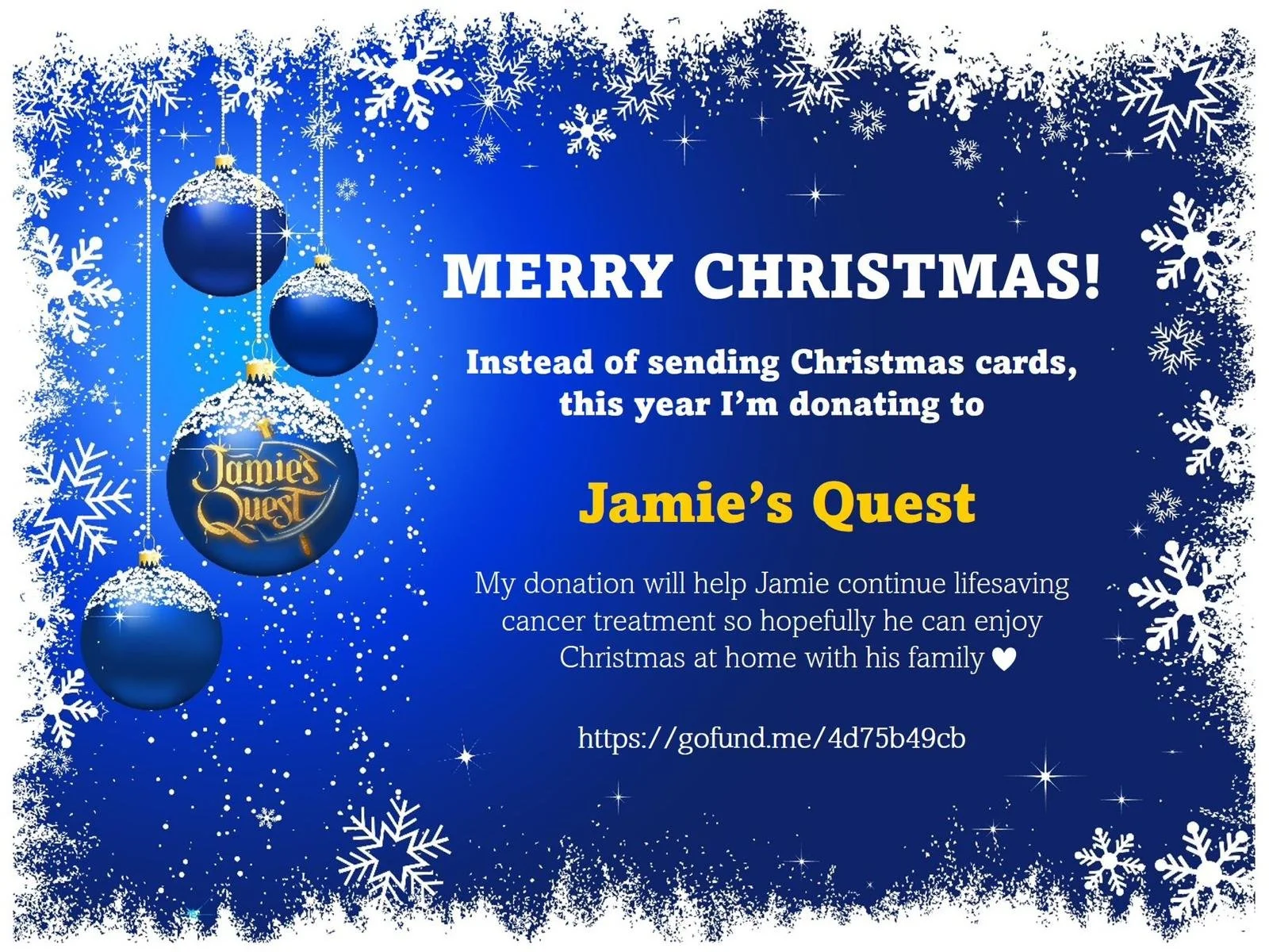 Instead of sending Christmas cards this year, how about donating to Jamie’s Quest instead?