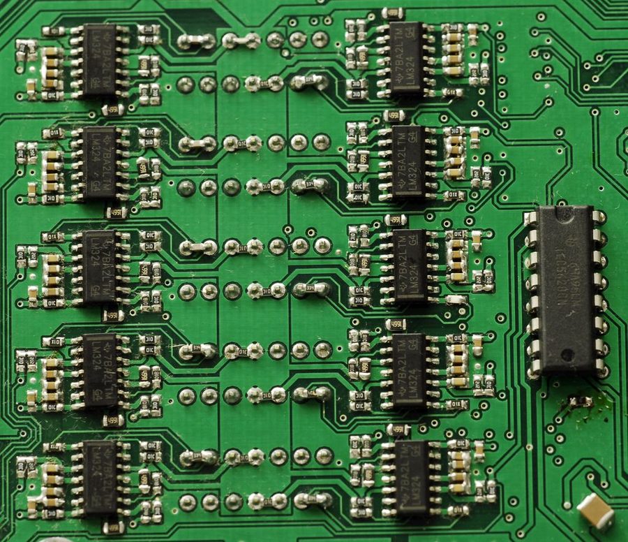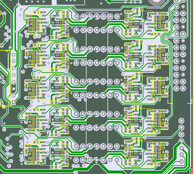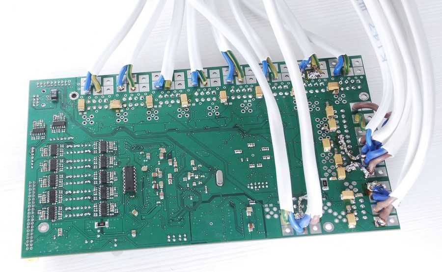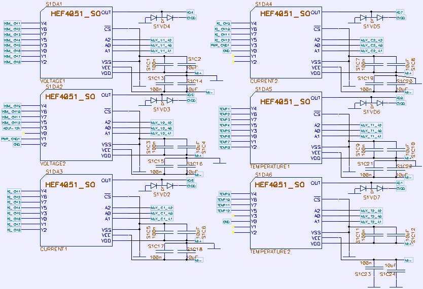 Since we have 12 independent DC load channels, with both voltage and current on each, we end up with no less than 24 analog voltages which need to be converted to digital. Since we have only two ADCs (one in MCU and one external) external switching of signals was implemented with regular HEF4051 single-ended 8-channel multiplexors. Multiplexors powered with +15 and -5VDC rails, to accommodate full 0-15VDC input signal range.