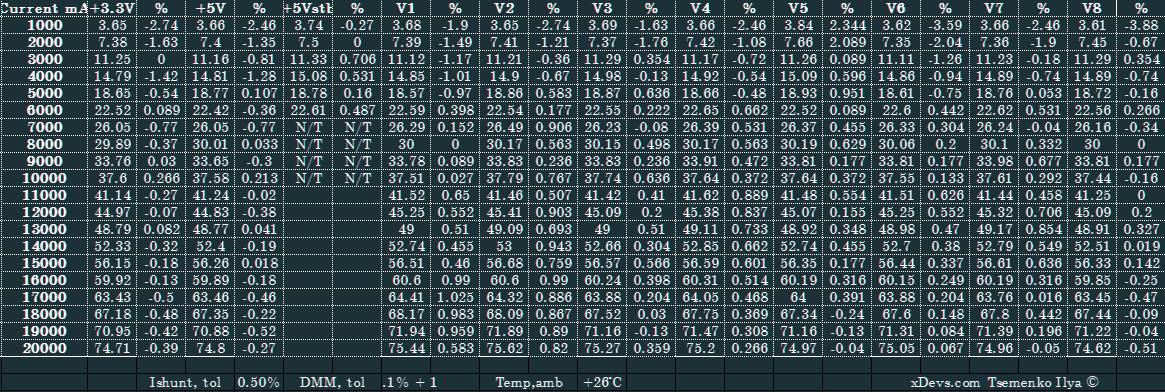 In automatic test operation ATE firmware run DC load sweeps from zero power at +12V to maximum defined load. Measurements for all voltages and currents are taken on every loading point, resulting automatic rendering of graphs for every channel. These graphs allow easy and fast evaluation of voltage regulation performance, on each specific loading crosspoint. X axis shows total loaded power on high-power +12VDC channels, while Y axis used for total loaded power for +3.3V and +5V channel, combined. Every point on graph shows combined total power on PSU. Each signle graph shows voltage deviation from specification (with +3.300V, +5.000 or +12.00 VDC as 0% deviation, ideal level). For easy understanding each 1% gradation is colored with own color, till voltage goes off limits -5% or +5%. Use green color for 0%, blue color for lower voltage, red color for higher voltages makes evaluation of PSU performance regulation very easy – more green – better regulation, more red or blue – bad regulation.