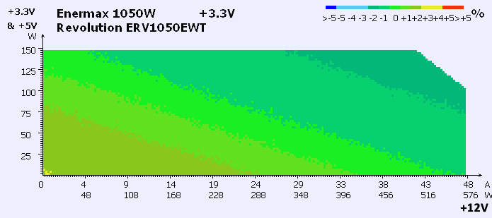 All main channels well within 2%, with Standby barely hitting 3% at low loads. Overall graph understanding this is easy, more greenish – better. Color is showing how much output voltage deviate from ideal level. ATX standard require PSU to meet 5% max deviation with any possible load configuration.