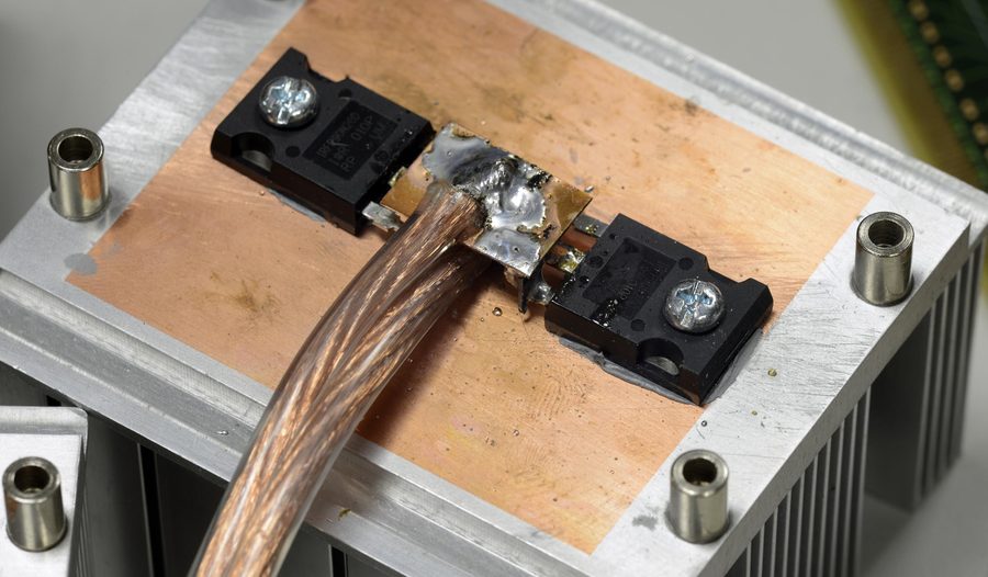 Design was started from key block of test system – DC load channel. Since our target is to have high power output, big fansink use is a must. Original prototype was using expensive IRF FB180SA10P HEXFETs to take up to 300W. These MOSFETs have big isolated industrial ISOTOP package (SOT-227) with thermal resistance only 0.05 °C/W. It’s one of most important parameters for FET in application like linear DC load, since almost all power will be taken by transistor and converted into heat. With today high-current MOSFETs heat dissipation performance is a limiting factor for constant operation DC load. Based on this, proper heatsink can be calculated and actual MOSFET die temperature can be estimated.