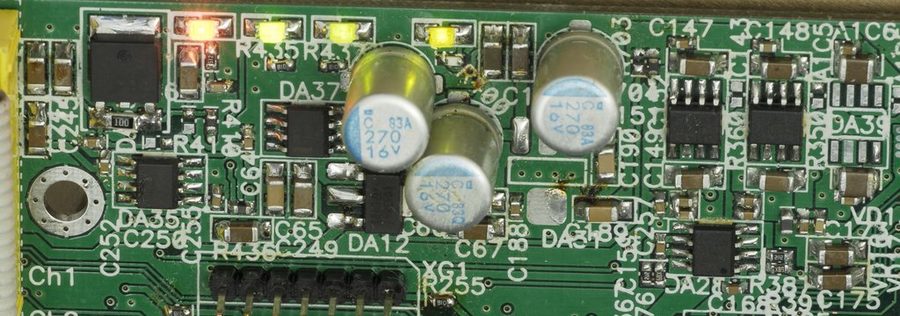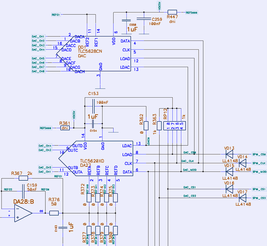 Now, let’s take a look on DACs, which generate control signals to set current on each channel. Texas Instruments TLC5628 and TLC5620 were used. There 8-bit DACs can generate voltages up to +5VDC and have recommended load of 10 kΩ. Output settling time is just 10 µs with signal bandwidth at 100kHz. This is more than enough for our DC load application.
