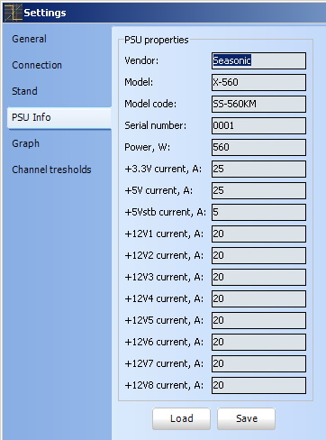 Most common used setting tab, with PSU information allow user to set manufacturer information, such as brand, model, serial number, rated power limit, as well as specific current limits on each rail.