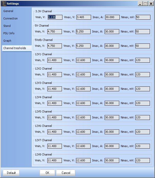 Thresholds setting are controls for PASS/FAIL limit indicators, each rail separately.