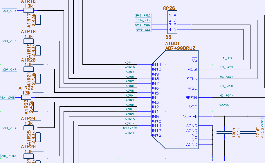Analog Devices AD7490 16-channel 1MSPS ADC. It also have two 4051 MUX ICs for AC coupled measurement (such as voltage noise/ripple). Every high-voltage input divided by simple R2R and protected by Shottky diodes. Power decoupled close to chips by multiple capacitors of different size and value. This ADC have 12 bits of resolution, which in theory can provide us 0.0036V per LSB for +15V input range (with divider).