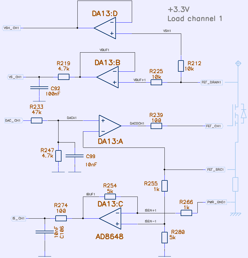 DA13.A takes input voltage signal from DAC and drive power MOSFETs gate. DA13.C forms amplifier for current signal from low-resistance shunt, located right at FET pins. Shunt resistance is in range 10-20 mΩ to minimize power dissipated in shunt. Few standard 10W ceramic shunts in parallel connection are used.