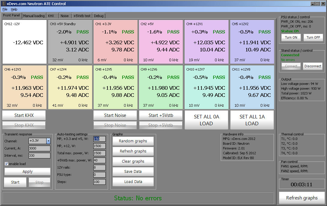 All channels fully independent and can be adjusted at any time in manual mode. This allows to apply any combination of constant load current for longterm PSU testing. Monitoring of input voltages and currents is continuous in realtime, to allow quick evaluation of each channel.
