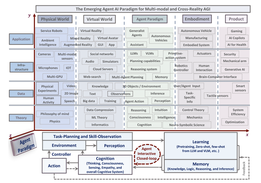 主要讨论了多模态人工智能系统,尤其是智能体Agent在物理和虚拟环境中的交互性。论文核心分为五个部分:Agent AI的概念、Agent AI存在的挑战、Agent AI的学习、Agent AI的分类与应用、跨模态、跨领域和跨现实的Agent AI。