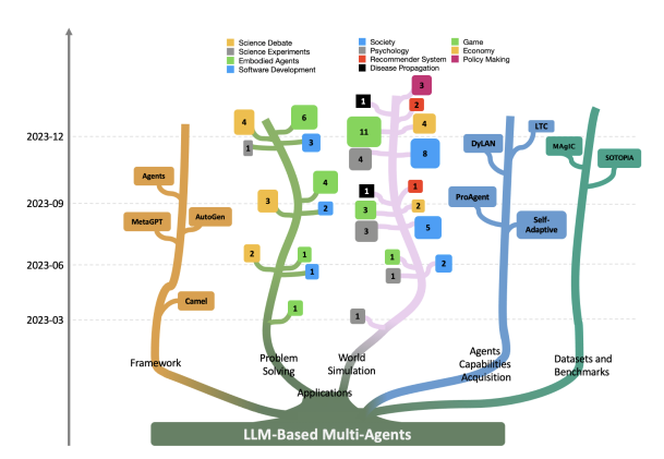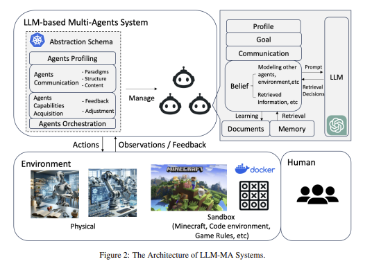 本文由南方科技大学等多所学校联合撰写。分析了LLM多智能体所模拟的领域和环境、这些智能体的特征及其通信方式,以及促进智能体能力发展的机制。