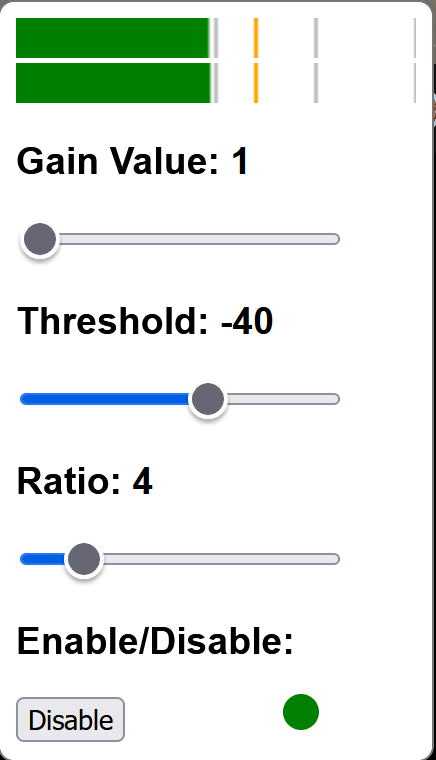 This is an enhanced version of https://github.com/padenot/up-to-eleven: the input gain for the gain section, and the threshold and ratio for the compressor are now controlled by sliders in a pop up window.