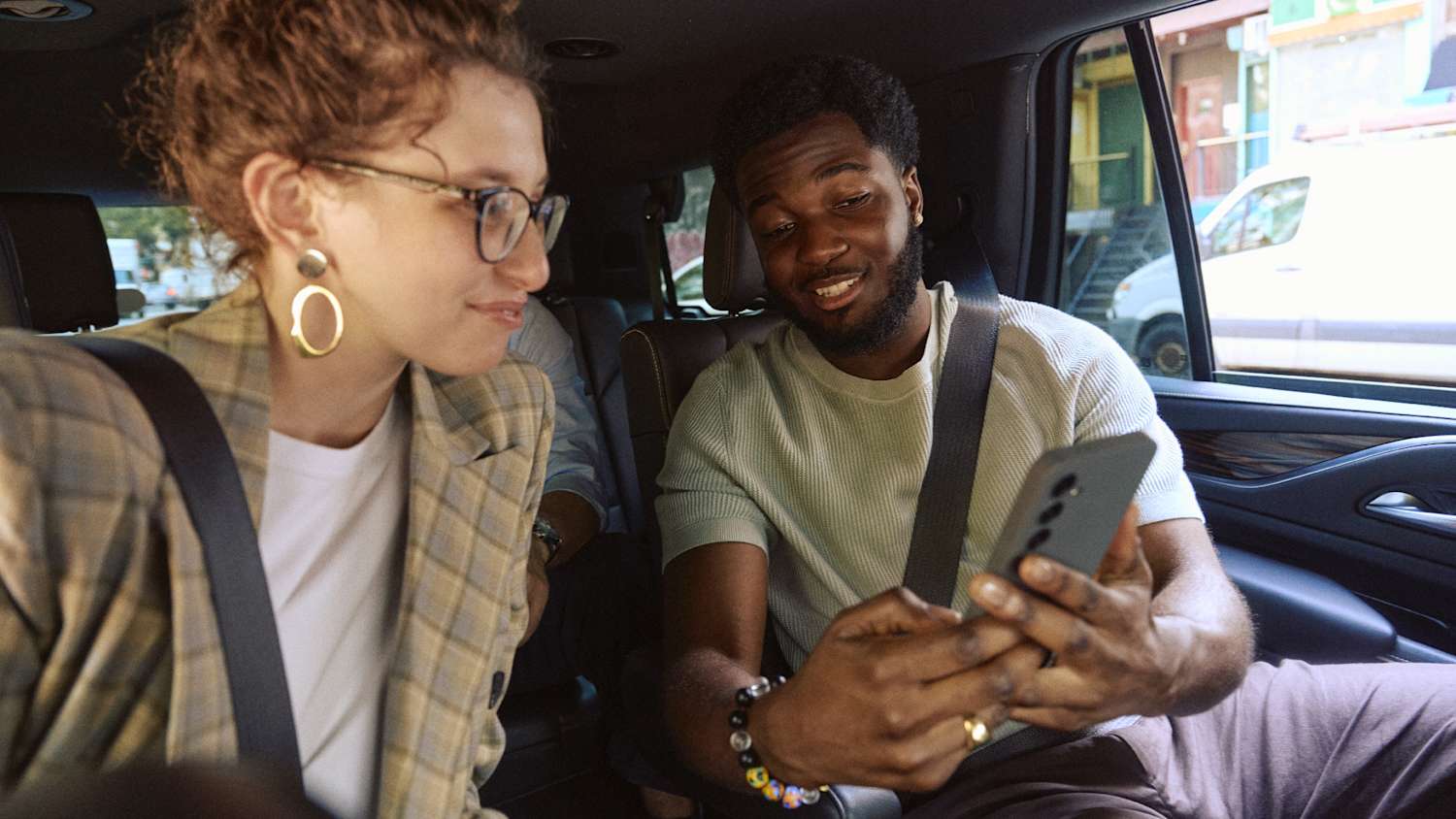 Two people smiling and talking in the backseat of a car, both wearing seatbelts and casual clothes.