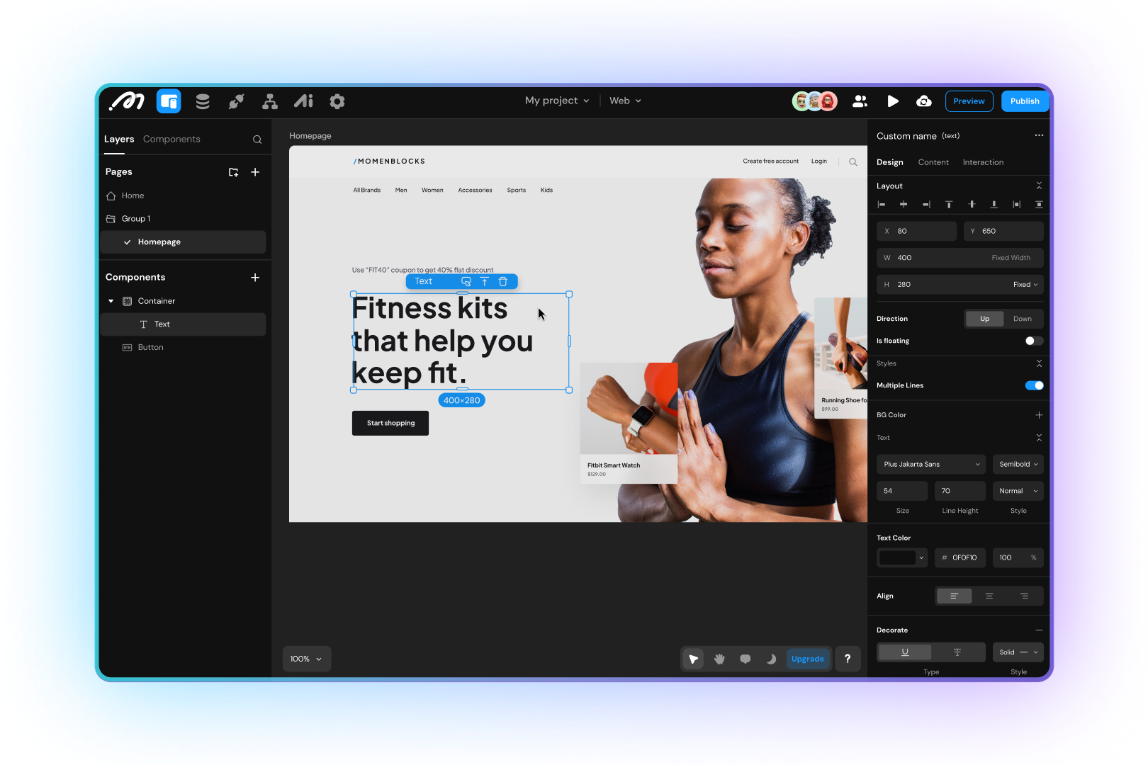 Visually design your app like you would in Figma — responsive, clean, and fully customizable with code when needed.