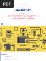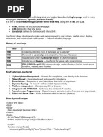 JavaScript is the programming language of the web and was invented in 1995 by Brendan Eich. It can change HTML content and attributes, CSS styles, and display data in different ways such as writing to elements, document output, alerts, and the browser console. Variables store data values and primitive data types include simple values without properties or methods.